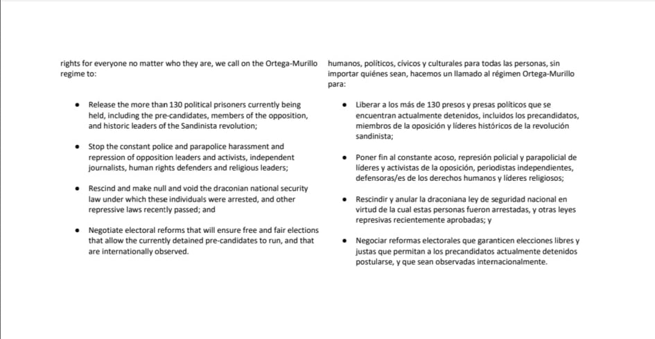 Otros firmantes mostraron consternación y enojo, señalando a Ortega como traidor a los principios de la revolución sandinista. Asimismo, condenan la creciente represión política y violencia del gobierno nicaragüense contra su propio pueblo al encarcelar ilegalmente a más de 130 personas, incluidos 26 líderes políticos de la oposición que fueron secuestrados/as violentamente desde junio. «Están recluidos/as en cárceles secretas y no se les permite ningún contacto con sus familias o representantes legales, quienes temen por su seguridad, su integridad y sus vidas. Su secuestro de facto y desaparición, así como la continua represión y hostigamiento contra los grupos de oposición, han descartado cualquier posibilidad de elecciones libres y justas previstas para noviembre de 2021», dice la nota de prensa.