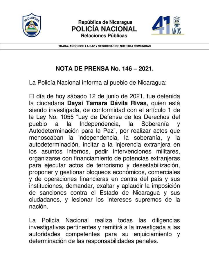 Támara Dávila también es parte de la Unidad Nacional Azul y Blanco, UNAB, y había estado denunciando la sustracción ilegal que hizo la Policía a la líder opositora Violeta Granera, a quien le habían dictado casa por cárcel e inesperadamente la Policía se la llevó a las celdas de El Chipote.