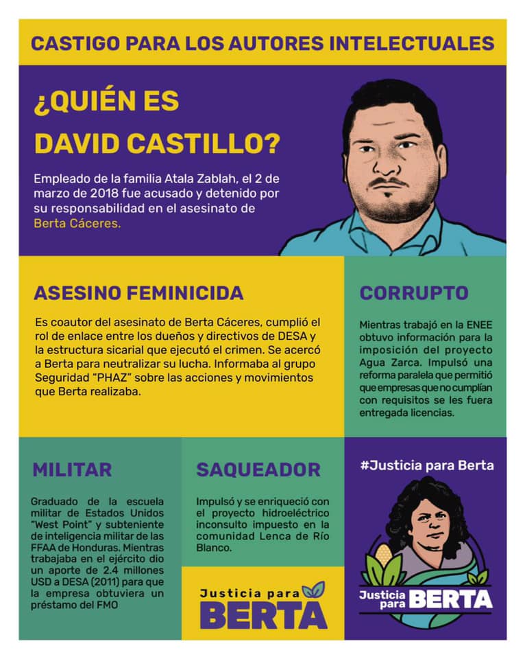 Castillo, ejecutivo de la empresa Desarrollos Energéticos S.A (DESA), fue condenado como «coautor intelectual» del asesinato de la ambientalista de la etnia lenca y puede enfrentar una pena de entre 20 y 25 años, agregó.