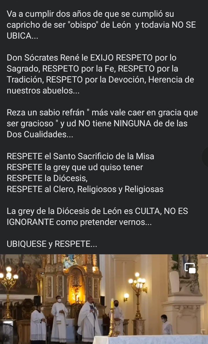 Uno de los sacerdotes que habló bajo anonimato expresó que “74 años después un obispo indigno de esta hermosa Diócesis, que la gobierna como lo haría un finquero o un capataz (con el respeto que este noble trabajo se merece) ha cambiado el grito”.
