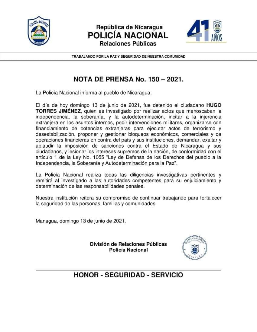 La Policía emitió un nuevo comunicado con las mismas características que ha utilizado para «justificar» las detenciones de activistas políticos, sociales y precandidatos presidenciales. El argumento de la Ley 1055, Ley de Defensa de los Derechos del pueblo a la Independencia, la Soberanía y Autodeterminación para la Paz- «El ciudadano Torres Jiménez, es investigado por realizar actos que menoscaben la independencia, la soberanía, y la autodeterminación, incitar a la injerencia extranjera en los asuntos internos, pedir intervenciones militares»