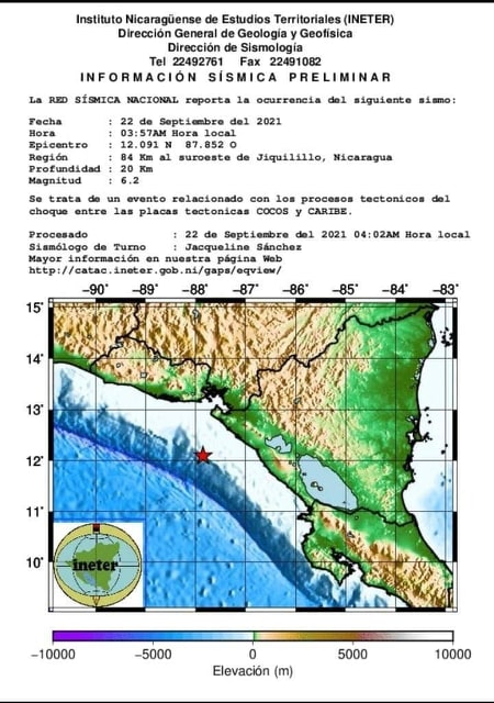 Un sismo de 6.2 grados de magnitud en la escala de Ritcher y 20 kilómetros de profundidad sacudió esta madrugada (3,57 hora local) Nicaragua, según informó el Instituto Nicaragüense de Estudios Territoriales, INETER.