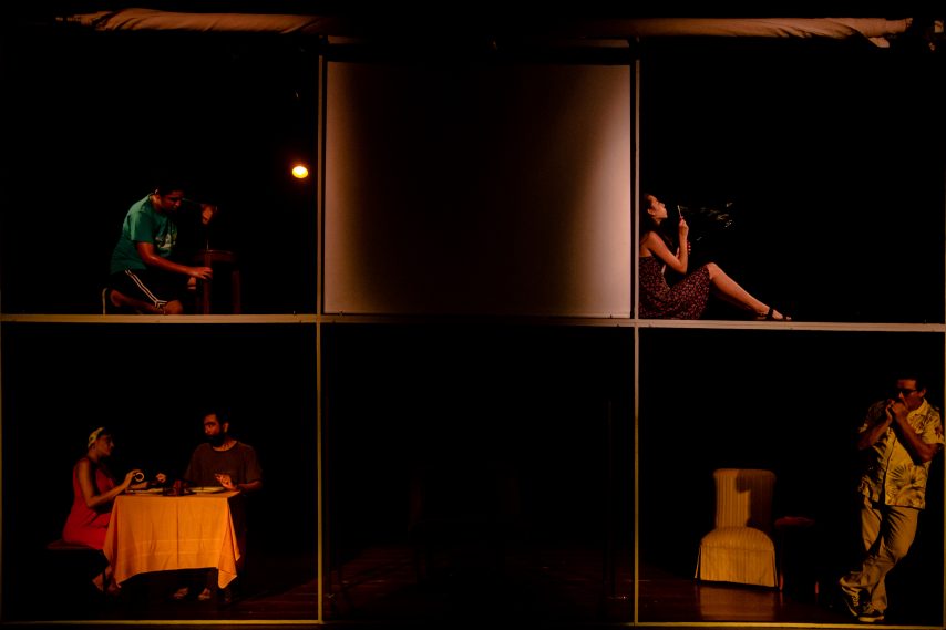 La puesta en escena nos invita a ver la vida íntima de cuatro personajes como si los viéramos a través de una pantalla televisiva o de la plataforma de zoom, constituyendo en cierta forma una metáfora del encierro en la que de alguna manera todos estamos atrapados.